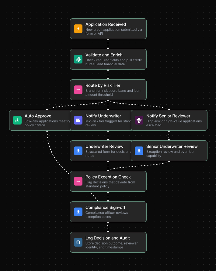 Every decision path — auto-approve, underwriter review, or senior escalation — feeds into the same audit log, ensuring every credit decision is fully traceable regardless of which path it took.