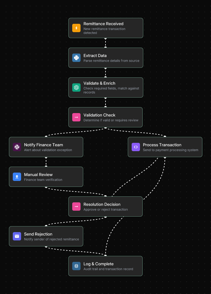 Below is an example of a remittance validation workflow in Jinba Flow — automatically parsing incoming remittance data, validating against records, and routing exceptions to the finance team for manual review: