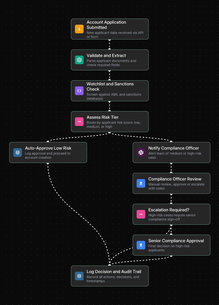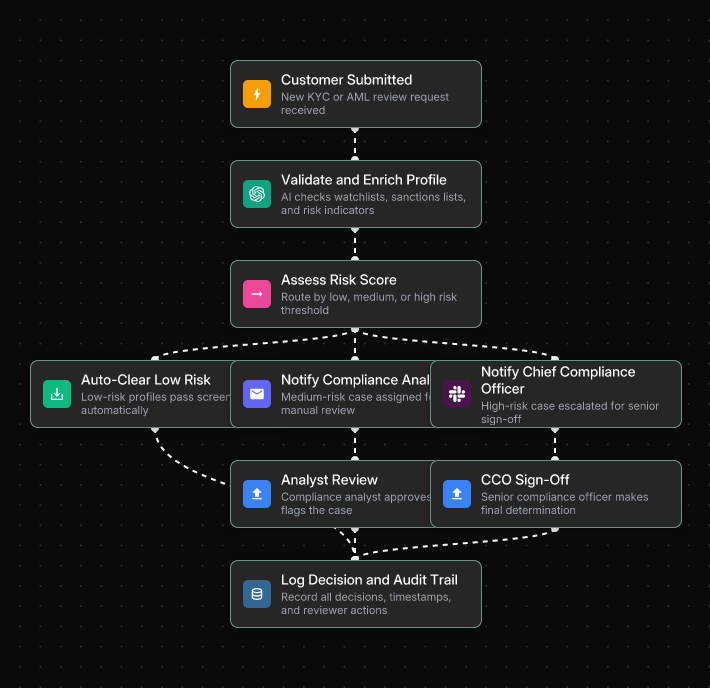 Critically, designing a good escalation flow is as important as picking the right tool. AI compliance workflows must include clear human-in-the-loop checkpoints for edge cases, sanctions screening, and high-risk decisions. Automation augments judgment — it does not replace it.