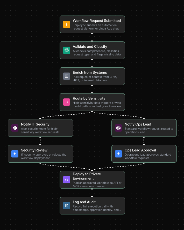 Below is an example of how a workflow deployment request is handled in Jinba Flow — routing based on data sensitivity, enforcing security review for high-sensitivity requests, and deploying only to approved private environments: