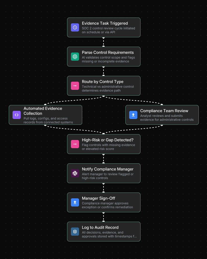 Here is what an automated audit trail workflow looks like in practice — triggering evidence collection on a SOC 2 review cycle, routing by control type, and logging every decision to an immutable audit record: