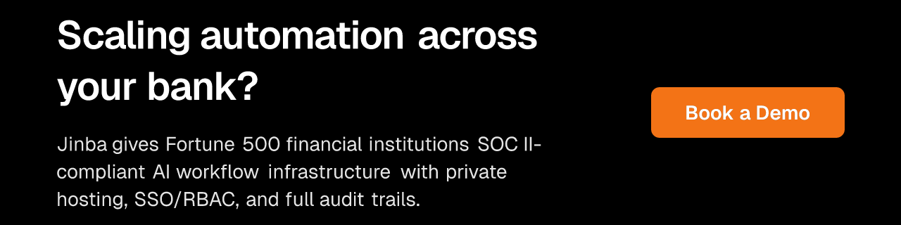 Jinba is a YC-backed, SOC II compliant AI workflow builder purpose-built for Fortune 500 enterprises. With over 40,000 enterprise users daily, it provides the security, governance, and flexibility that financial institutions require — without sacrificing speed or usability.