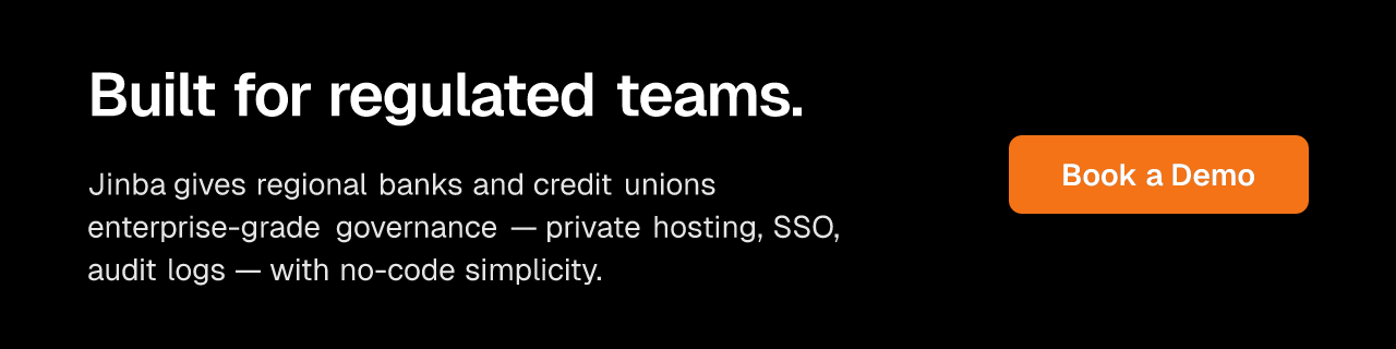 For regional banks and credit unions that need agility without compromising on compliance, Jinba is worth a close look. It's a YC-backed, SOC II compliant AI workflow builder that combines no-code ease with the security controls financial institutions require.