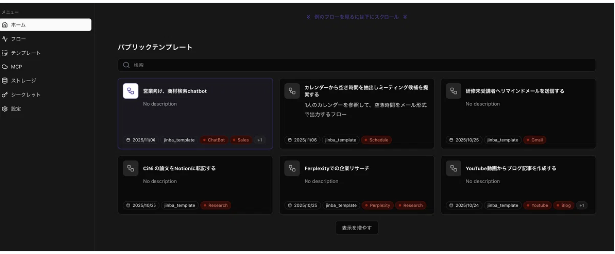 Jinba Flow のテンプレートを使えば、誰かが作った便利なワークフローを自分の環境でそのまま再現できます。