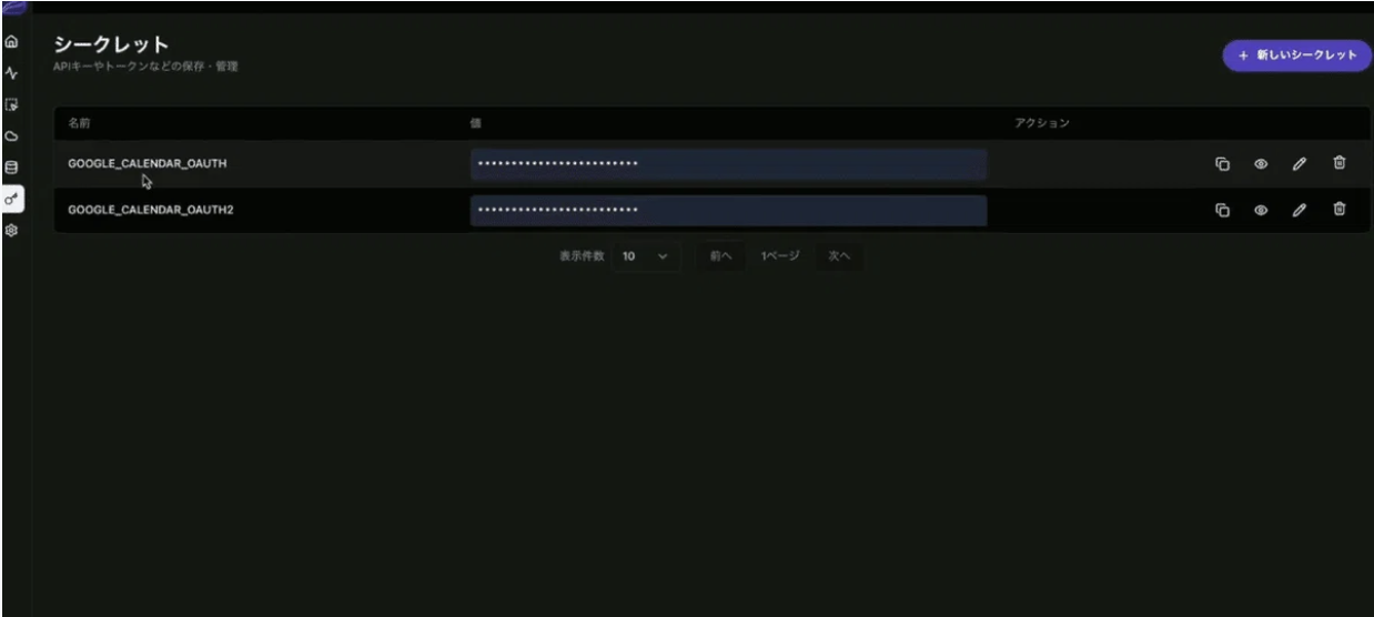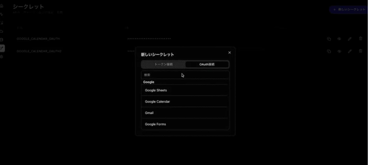 - “新しいシークレット” →Google Calendarを選ぶunknown nodeシークレットの名前は、メールアドレスの違いが分かるように設定してあげるのがおすすめです。