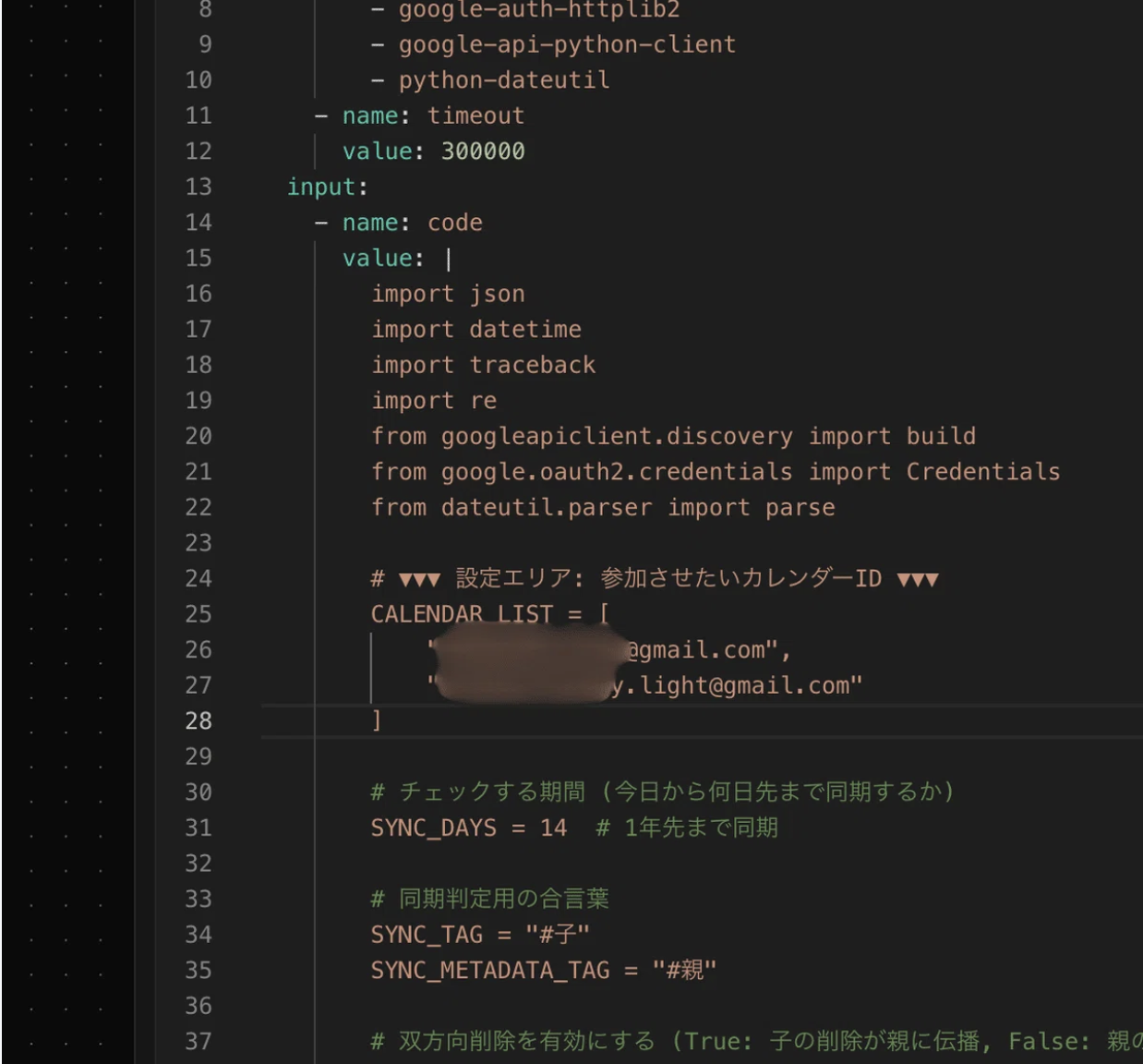 - CALENDAR_LIST:同期したいカレンダーのID(Gmailアドレス)を入れる