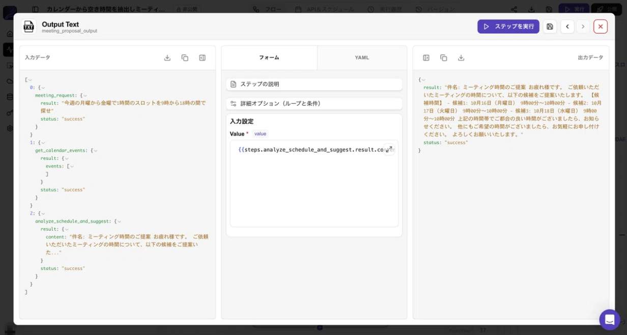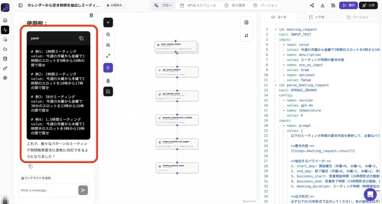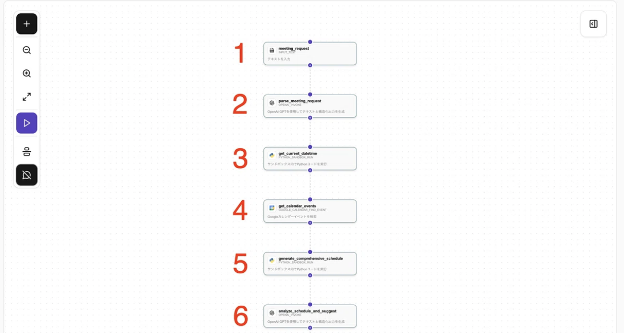 unknown nodeunknown node①meeting_requestunknown nodeここにはこのフローにやって欲しいこと、指示文を入れます。unknown node今回は「今週水曜から土曜日の間で、10:00-22:00の間で2時間のミーティングを探したい」このように書きました。unknown nodeunknown node②parse_meeting_requestunknown nodeここではLLMが①で受け取った文章から必要なパラメータを抜き出し、Json形式に書き換えています。unknown node何曜日から何曜日なのか、時間は何時から何時の間なのか、何時間のミーティングなのかをこの後pythonに渡して問題ない形に変えてくれています。unknown nodeunknown node③get_current_datetimeunknown nodeここでは現在日時、時刻を確定させ、カレンダーAPIから情報を受け取りやすくするような形式に変更するpythonのコードになります。unknown nodeunknown node④get_calendar_eventsunknown nodegoogle カレンダーのAPIを利用して予定を確認します。unknown nodeここで今週どんな予定があるのか、ない時間はいつなのかのデータを受け取ります。unknown nodeunknown node⑤generate_comprehensive_scheduleunknown nodeこのコードは、カレンダー上の予定をもとに、unknown node今後の営業時間内で会議を入れられる時間帯を自動で探す処理です。unknown node30分刻みで候補スロットを作り、既存の予定と重なる時間を除外し、最終的に「全員が空いている最適な会議候補時間」を一覧として出力しています。unknown nodeunknown node⑥analyze_schedule_and_suggestunknown nodeこのプロンプトは、カレンダー上の「空いている最適スロット(optimized_slots)」をもとに、今週ミーティングを設定できる時間帯を日本時間で整理した提案メール文を生成するよう求めています。unknown nodeunknown node⑦meeting_proposal_outputunknown nodeこれが今まで作ってきたフローのアウトプット部分になります。押してみると右側に⑥で出力された内容が表示されています。