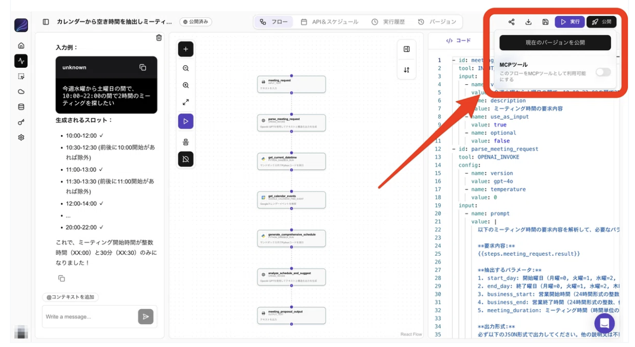 画像の右上、公開のボタンを押すとこのフローをMCPツールとして使用可能にするというスイッチボタンが出ます、これをオンにします。