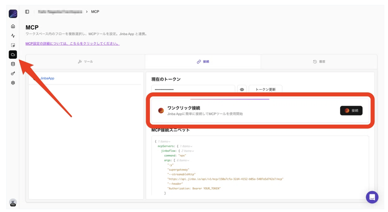 そして左のパネルの雲マークを押し、接続というタブに移動します。unknown nodeそこでJinba Appに接続というボタンが出るので押してみましょう。