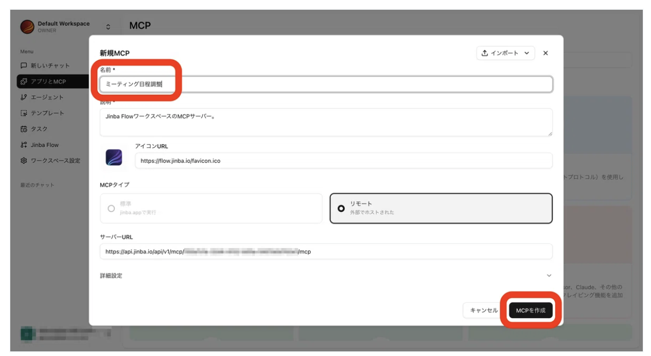 そこで名前に上記のようなものを入れてMCPを作成し、次にエージェントタブを押します。