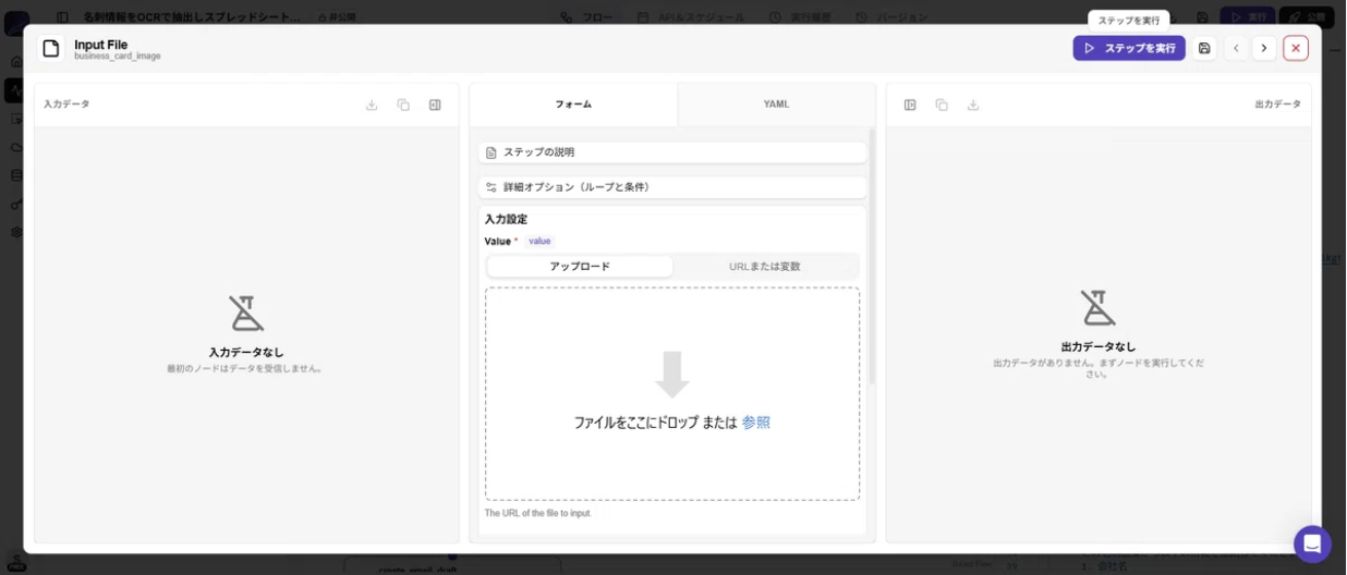 実際にワークフローを実行してみます。unknown node必要な名刺の写真を用意したら、「 business_card_image 」のモジュールをクリックし、