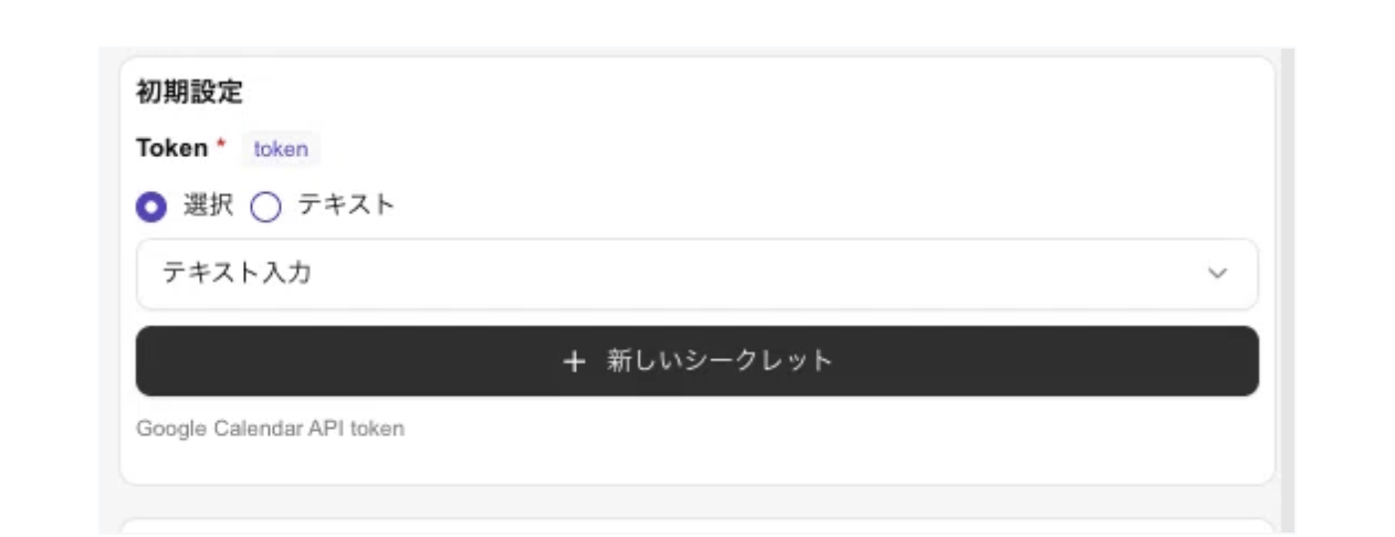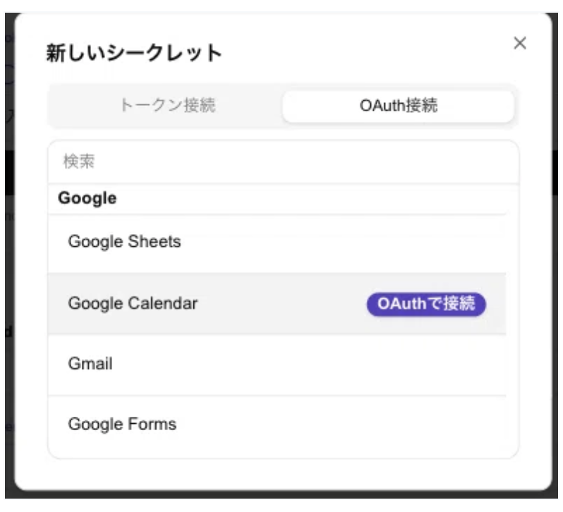 シークレットの登録画面が開きますので、「 OAuth接続 」 →「 Google calendar 」を選択、