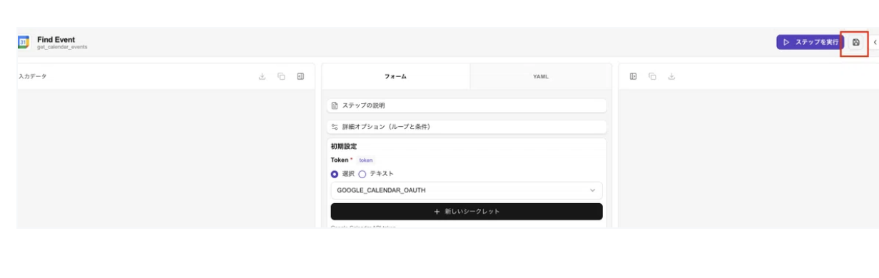 アカウントの連携が完了したら、再度ワークフローの画面に戻り、右上の実行ボタンを押します。