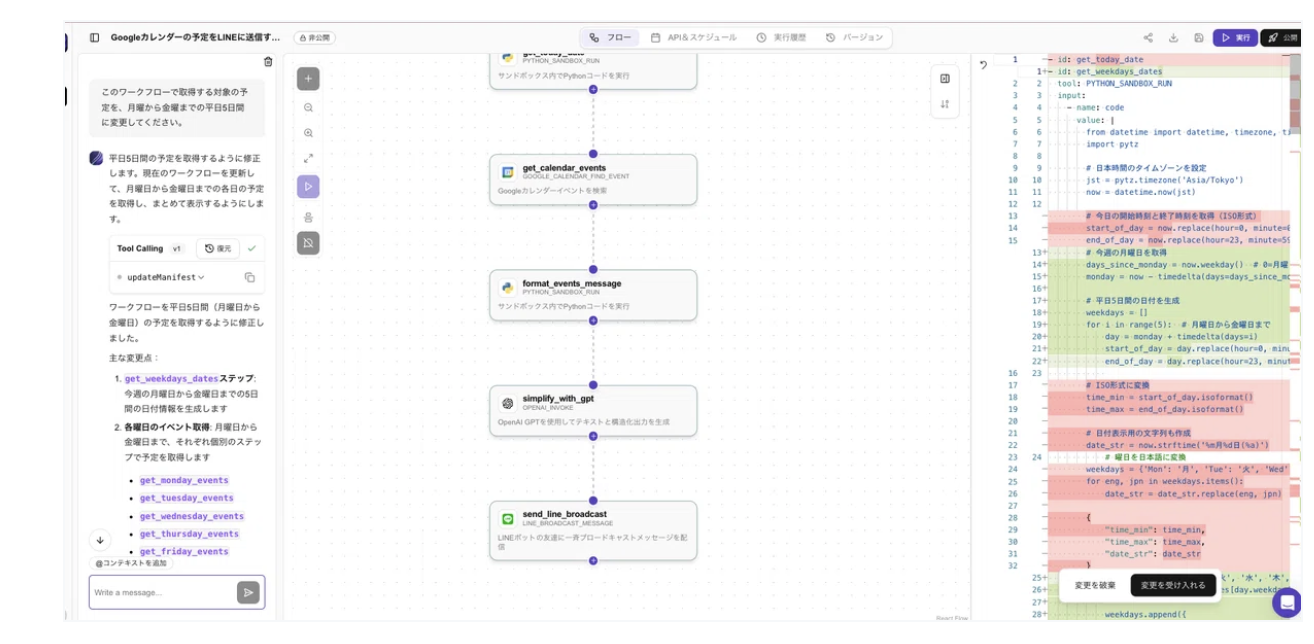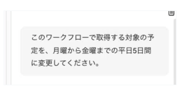このテンプレートは当日の予定を取得する仕様になっていますが、チャットで指示を加えることで一部修正・アレンジを行うことも可能です。