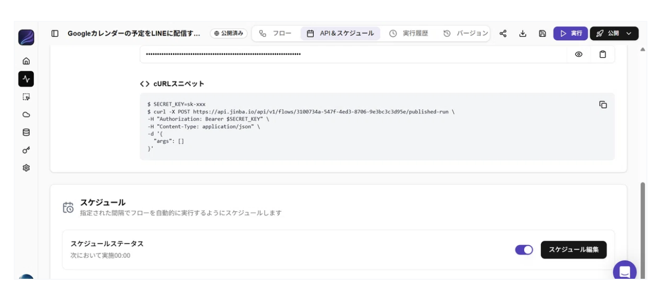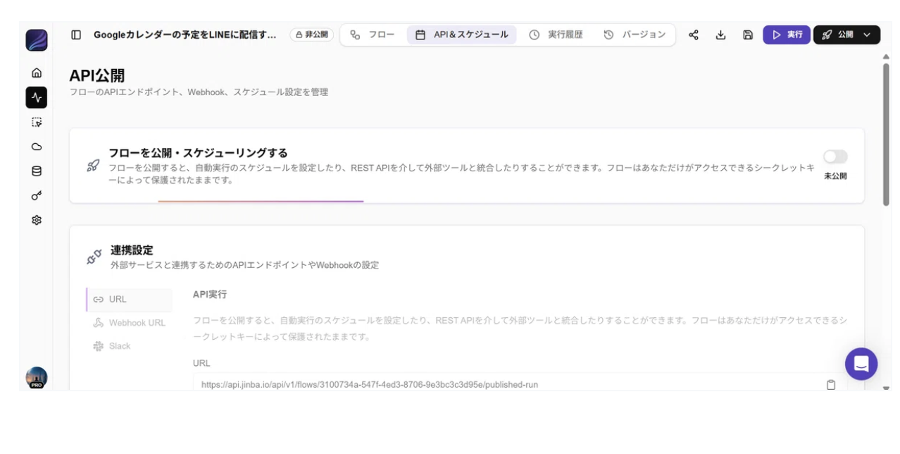 定期実行を設定するには、ワークフロー画面内で「 API&スケジュール 」に移動し、