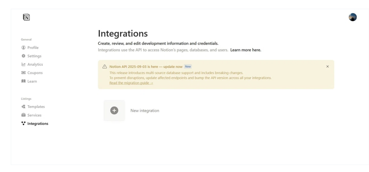 遷移先で「New Integrations」をクリックします。
