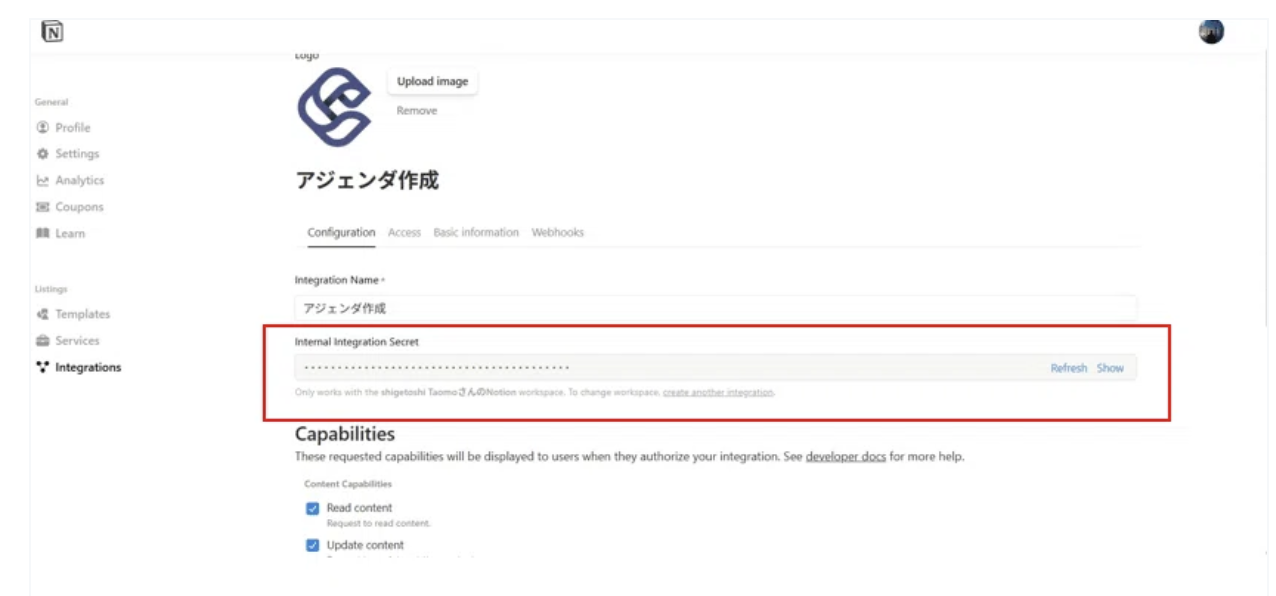 「Configuration」タブに戻り、「Internal Integration Secret」をコピーします。unknown node※シークレットの取り扱いには十分にご注意ください