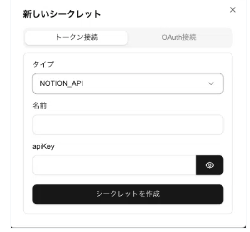 タイプ:NOTION_APIを選択し、APIKeyにNotion側でコピーしたシークレットを貼り付けます。