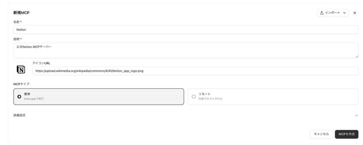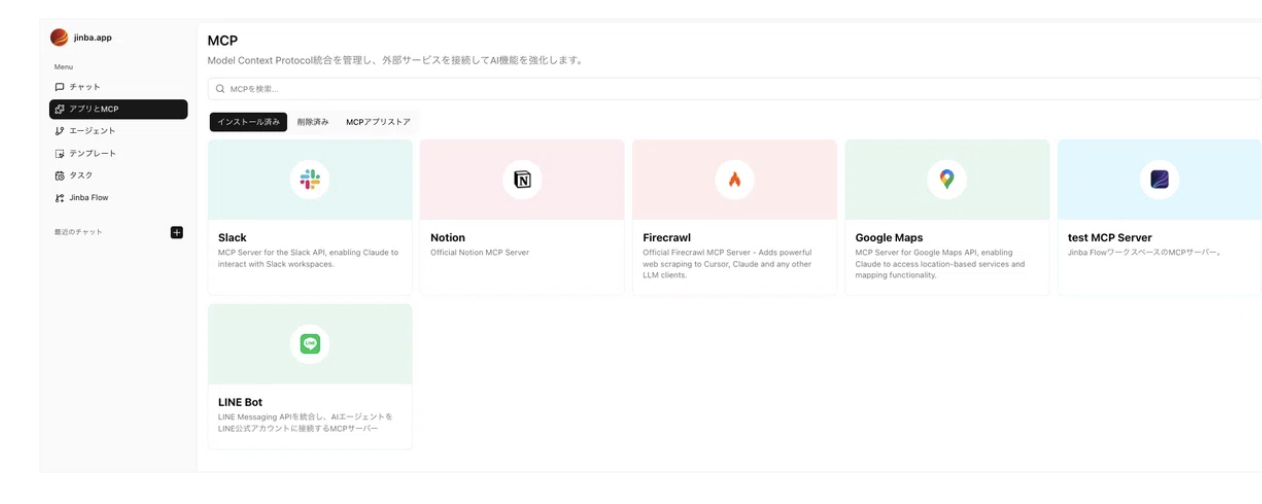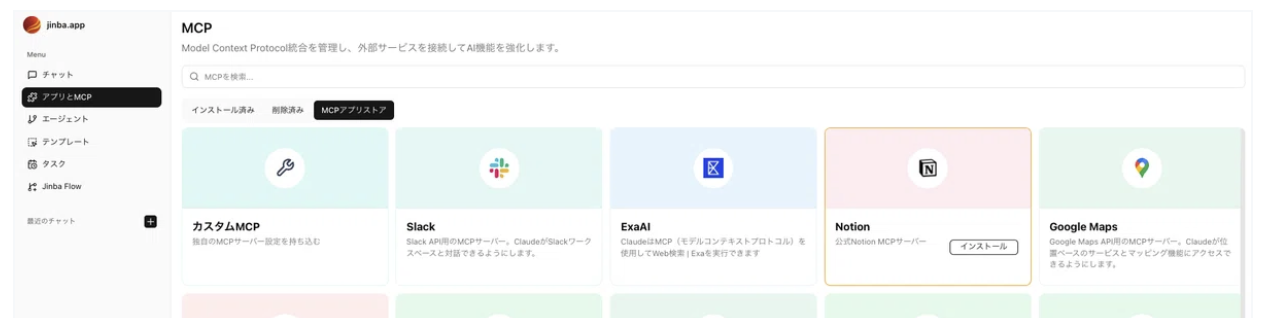 Jinba Appでの操作もご紹介します。unknown node「アプリとMCP」をクリックし、「MCPアプリストア」のタブを選択します。unknown nodeNotionを選択すると「インストール」ボタンが表示されるので、ボタンをクリックします。