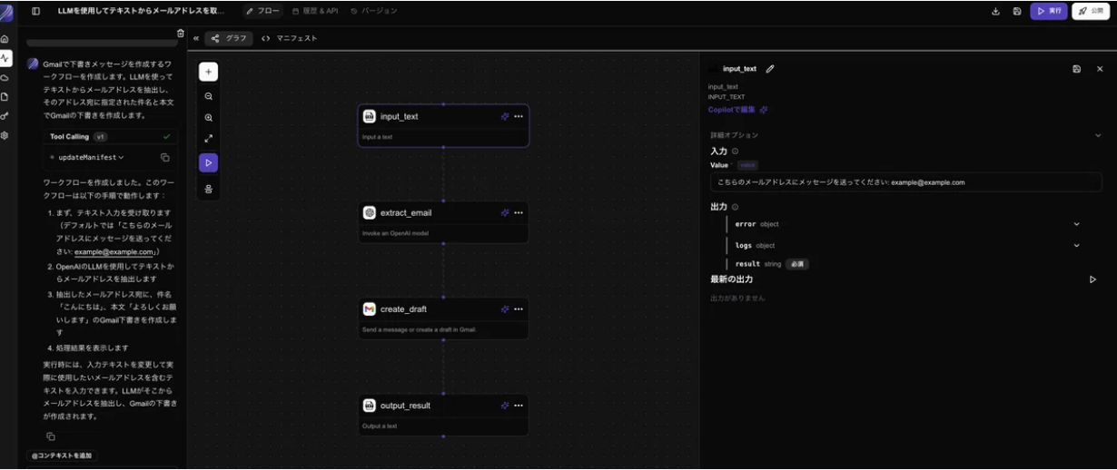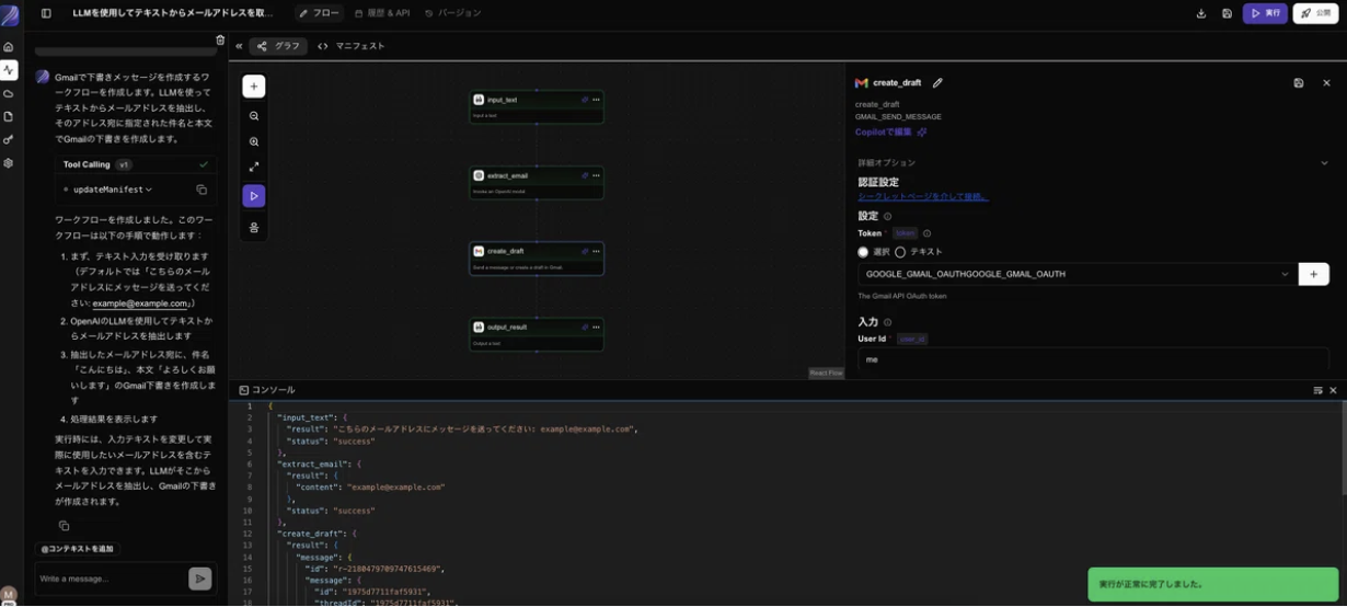 また、TOPのチャット画面にはサンプルとしていくつかテンプレートを用意しています。unknown node今回は試しにGmailに下書きを作成するフローを実行してみます。